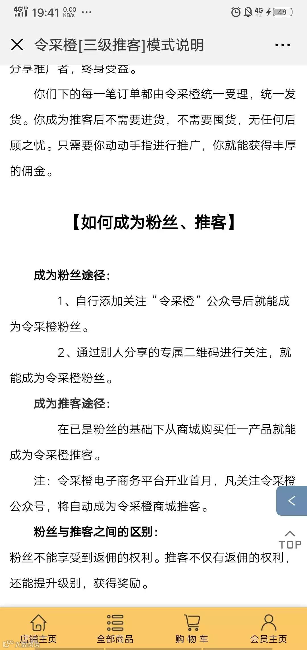 (如何成为粉丝:自己搜索或者通过别人分享的专属二维码关注公众号“令采橙 ”即可,粉丝和推客不同,粉丝不能享受分销返利,而推客不仅可以返佣,还能提升级别,获取更多奖励)