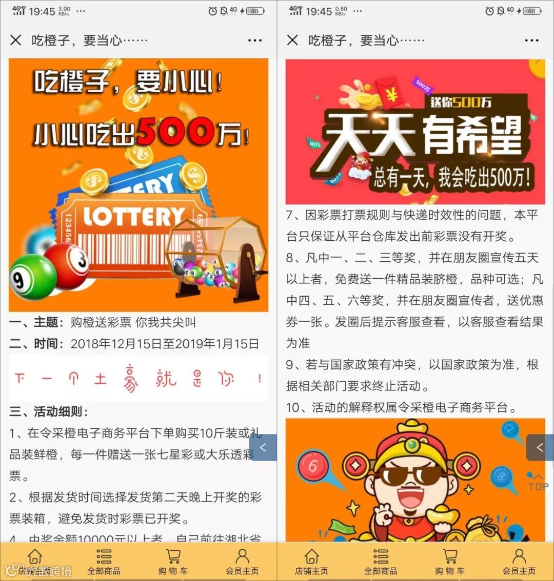 单纯靠打折无法为商城持续地吸引新客户,且长期促销容易增加商家的成本。所以在商城上线后不久,“令采橙”就推出了“购橙送彩票”的计划,用户在商城下单购买10斤装或者礼品装鲜橙,即可免费获赠一张七星彩或者大乐透彩票。