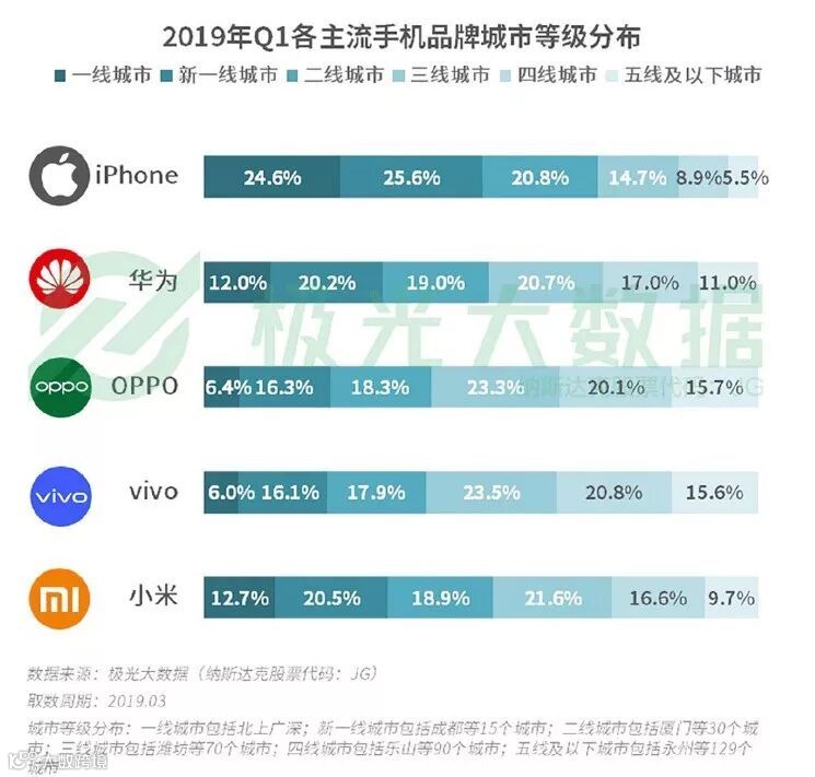 根据极光大数据统计,2019年Q1国内手机品牌销量占比top 5分别是华为、vivo、OPPO、小米和iPhone。
