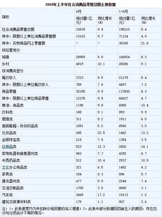 国家统计局7月15日发布数据显示,2019年上半年,社会消费品零售总额195210亿元,同比名义增长8.4%(扣除价格因素实际增长6.7%,以下除特殊说明外均为名义增长)。其中,6月份社会消费品零售总额33878亿元,同比增长9.8%。中国消费升级正在释放出的巨大经济机会。