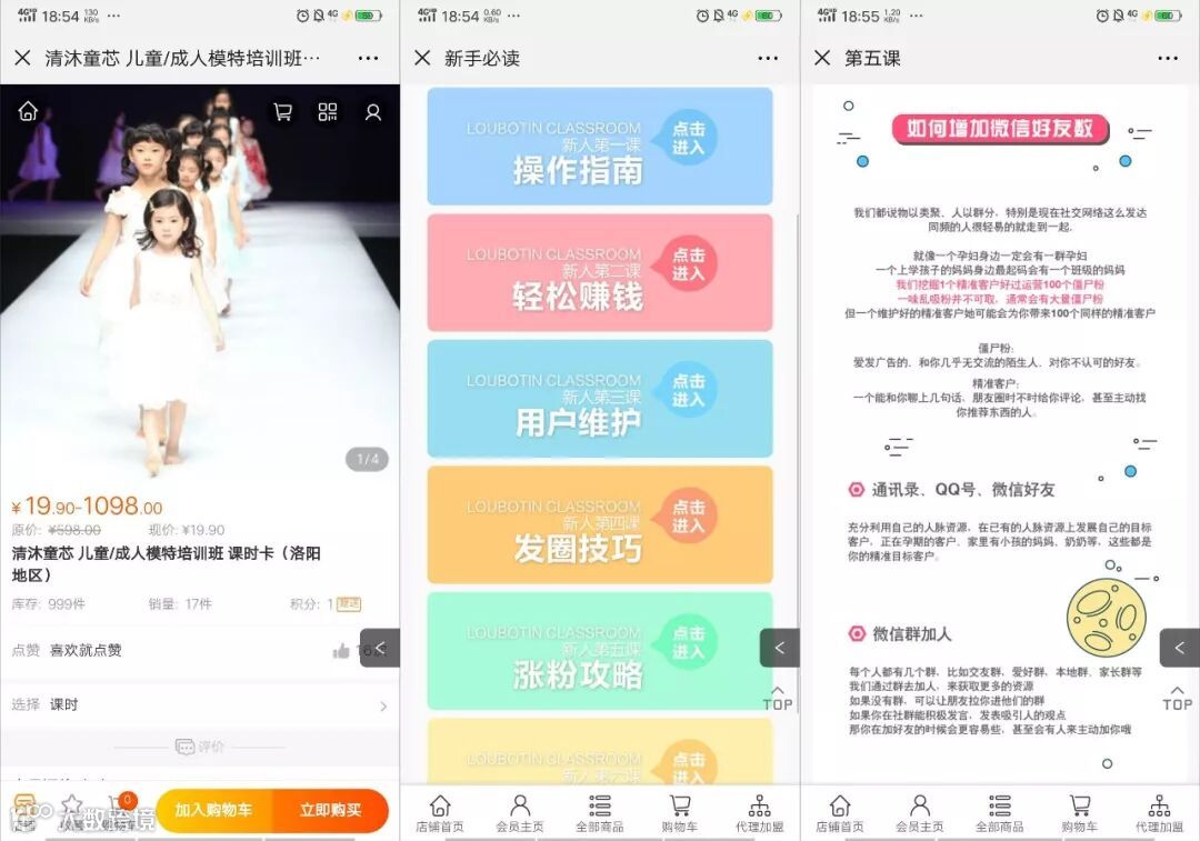 对于“兴趣生活”,萝卜丁童品商城售卖的是关于儿童特长兴趣班的产品,包括游泳圈、游泳眼镜和儿童/成人模特培训班 课时卡等产品,对于“新手课堂”,它为分销商详细说明了发朋友圈的技巧、涨粉攻略和社群激活方法,而且它的内容一直保持更新。
