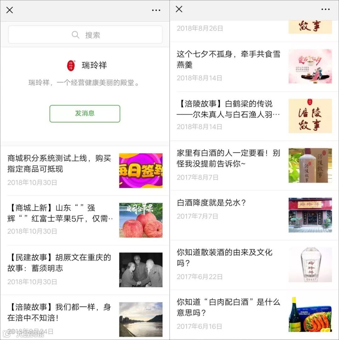 微信拥有10亿用户流量,在当下,你很难找到有人还没用微信的,所以对于商家来说,微信是一个很不错的宣传渠道。“瑞玲祥”正是基于这一点,申请了“瑞玲祥”公众号,并且通过公众号为粉丝输送内容,这些内容包括“瑞玲祥酒”的系列故事、商城上新的产品信息、商城促销信息等。
