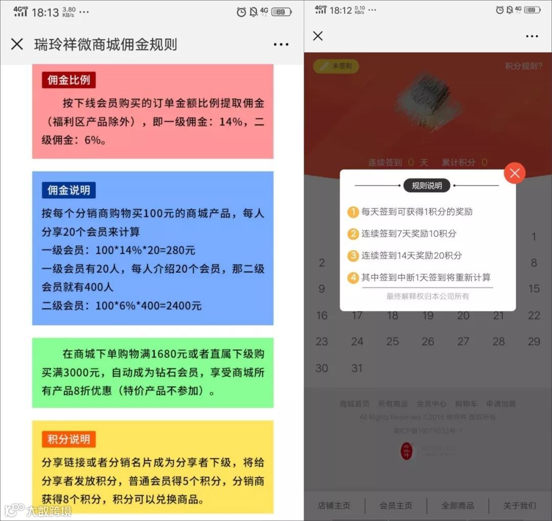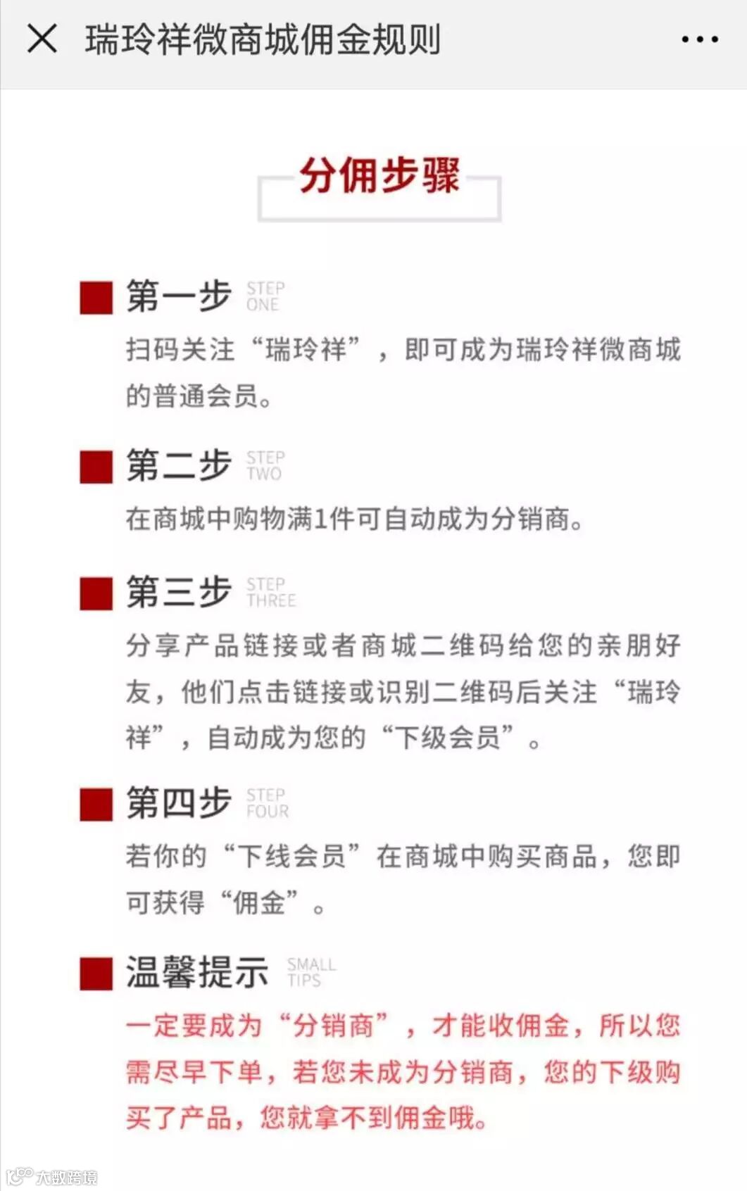 值得注意的是,“瑞玲祥”的分销商也是有门槛的,用户关注“瑞玲祥”公众号可成为商城“会员”,“会员”在商城购买1件商品可成为分销商。“门槛”的设置,使“瑞玲祥”的分销商都是商城的忠实粉丝,他们对商城认可度高,对商城产品的了解也比较深,可以帮助商城更好的宣传商品,减少商家对分销商的管理成本。