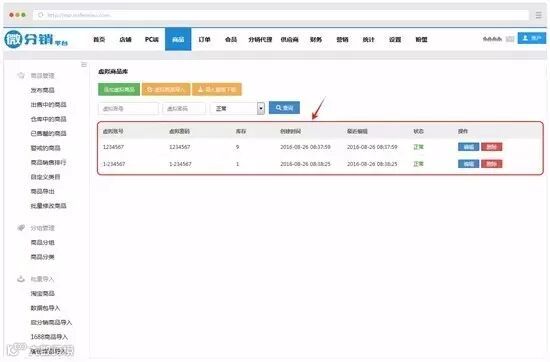 编辑完商品后,虚拟商品是没有库存的,在已售罄列表中,要根据自己上传的账号密码个数,来决定有多少库存----下图,有个虚拟商品库按钮-----