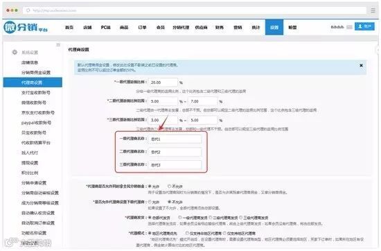 后台代理商设置里可以设置“一级代理商”、“二级代理商”、“三级代理商”的名称,比如可以把“一级代理商”名称设为“总代”等