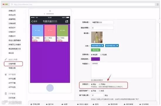 后台可以设置分享分销专题是否自动带上分销名片,利于公众号吸粉