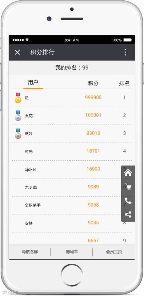 会员中心“我的积分”里增加“积分排行”,会员可以点击查看积分排名,并且查看自己是第几名。(卖家可以设置是否开启,默认是不开启的)