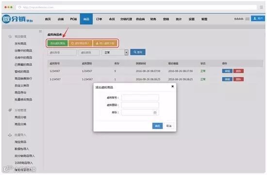 可以根据这些按钮,一条条手动添加虚拟商品,或者导出模板,在表格里做好所有账号密码和库存,再导入,方便大数据量的操作。