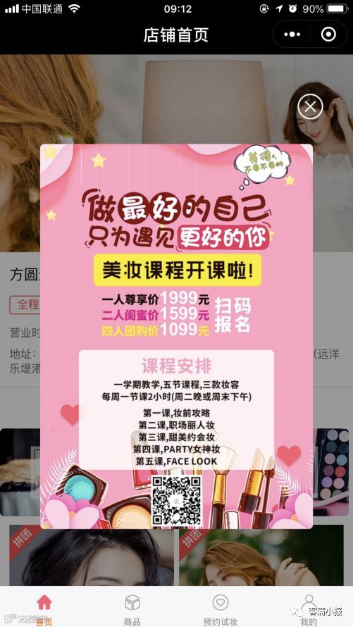 在累积一定老客后,方圆工作室开始借客满小程序营销工具发力,尝试老带新。美妆课程拼团属性即是老顾客邀请闺蜜好友一起参加成团达到老带新效果。拼团活动一星期单店平均日增长10个新顾客。拼团成功率高达50%,说明老带新拉客潜力很大。
