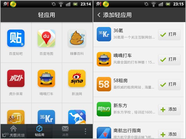 UC则随百度后,在浏览器中增加了轻应用的功能。阿里在2014年收购UC后,通过这种间接的方式试水轻应用。
