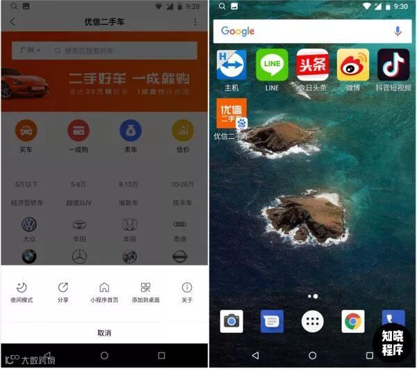 百度在今年4月,在百度APP中低调上线了优信二手车的小程序,这也是迄今为止,唯一能看到并使用的百度小程序。百度内测中的“优信二手车”小程序,用户可以通过扫码或进入常用服务打开使用,百度小程序的页面设置与微信小程序几乎无差别,在安卓手机中,也可直接“添加到桌面”。
