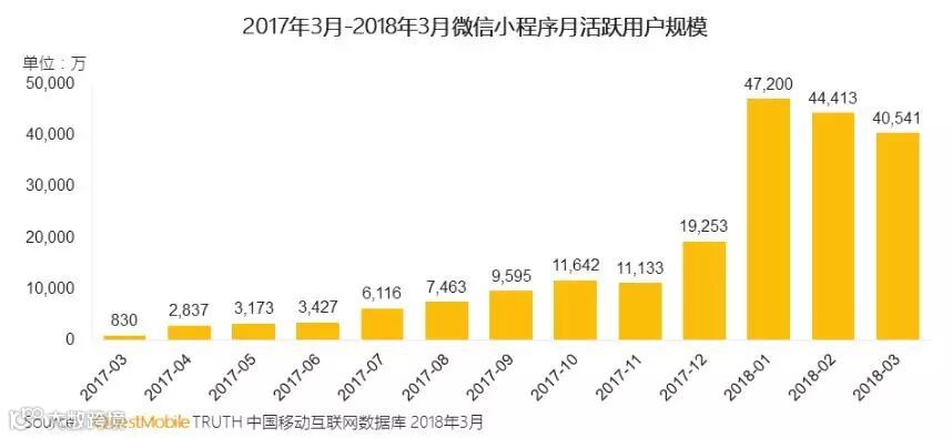 微信小程序用户规模呈爆发式增长,月活跃用户突破4亿。随着小程序应用场景的不断完善以及电商对其的拉动,用户使用小程序的习惯逐步养成,并呈现快速发展趋势。