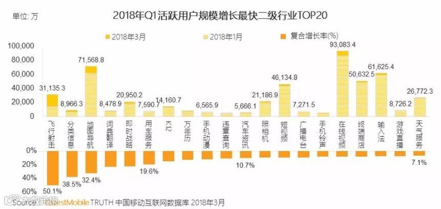 从整体来看,吃鸡游戏的火爆带动飞行射击类游戏成为增长最快的行业,分类信息、地图导航、天气服务、短视频行业等由于春节和寒假的影响,也迎来较快增长。
