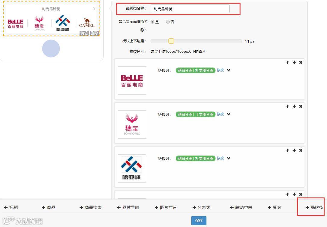 小程序后台→店铺→店铺主页:编辑店铺主页,增加“品牌街”装修模块,可以自定义”品牌街“的名称