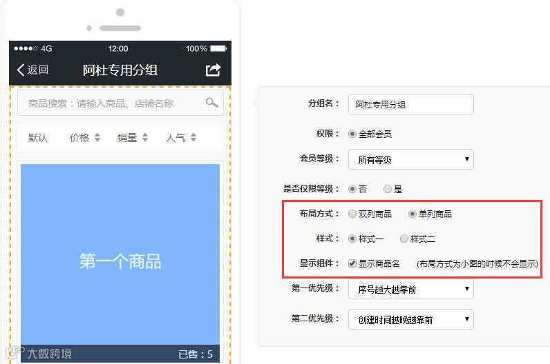 小程序后台→商品→商品分组:增加布局方式、样式(内容效果)和标题显示格式的选项。商家可以根据需求选择不同的装修风格