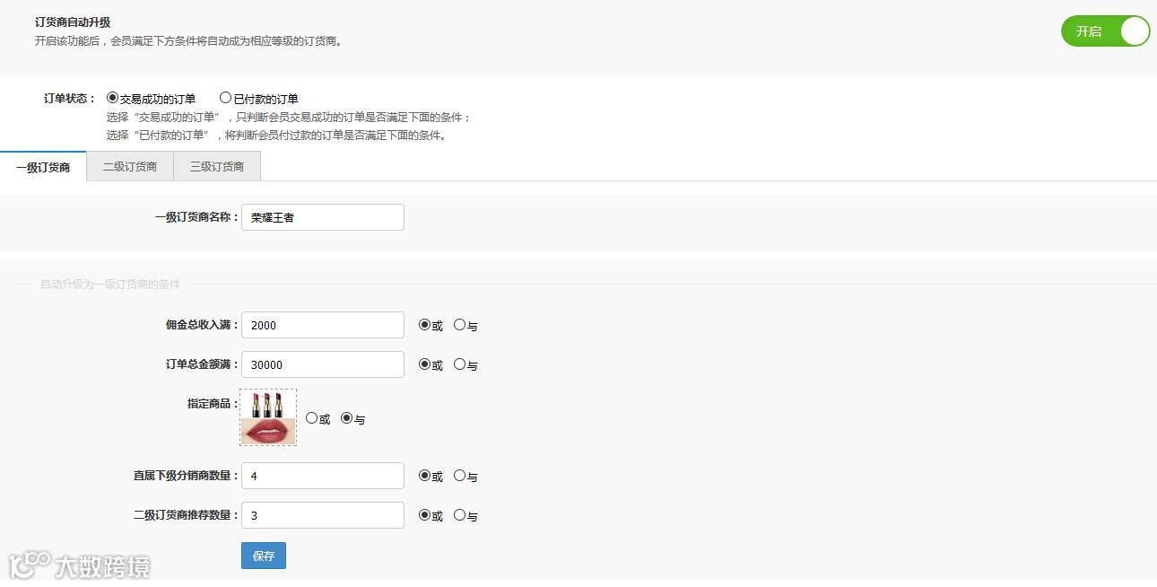 比如,一级订货商的升级条件如下:选择条件是“或”的话是满足条件之一就可以,选择条件是“与”的话就是当前条件必须满足