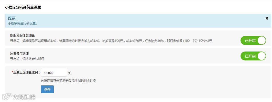 小程序后台→商品:发布商品或者编辑商品时,增加“佣金设置”模块,分销返佣开启后,商品佣金设置优先系统分销商佣金设置;分销返佣关闭时,不给返佣