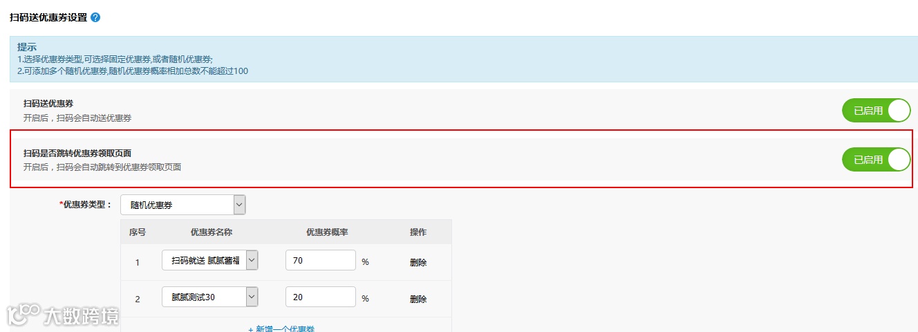 备注:扫码送优惠券,这里的扫码主要包括:商品二维码、店铺二维码、分销中心二维码。
