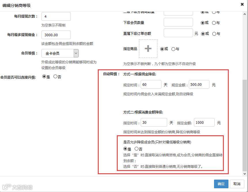 ① 根据消费金额降级:指定时间未达到指定金额的分销商,降低分销商等级