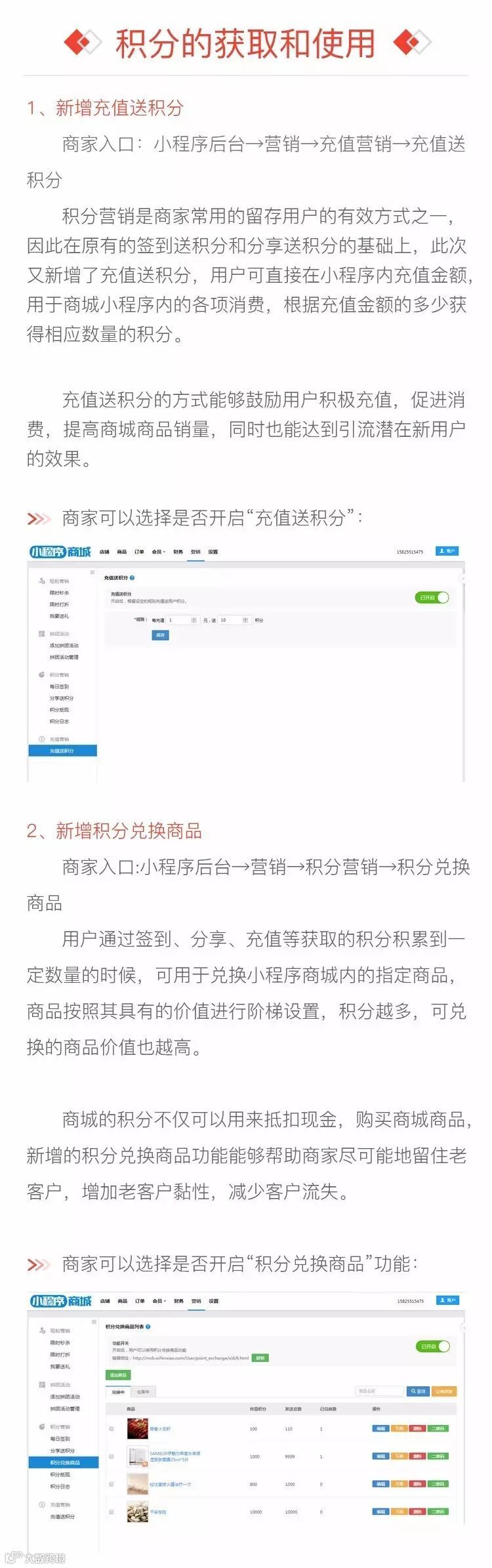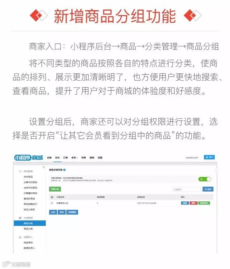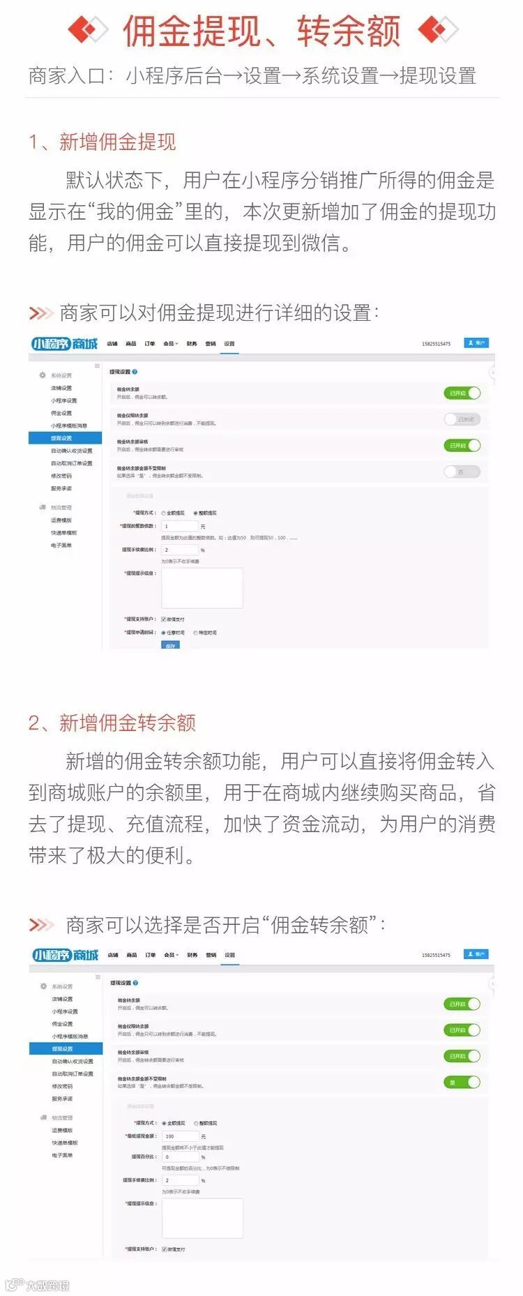导读:小程序新功能:1、佣金提现、转余额;2、积分获取、使用(充值送积分、积分兑换商品);3、商品分组;4、优化会员中心…