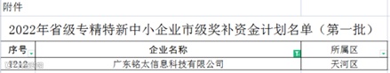 2月20日,广州市工业和信息化局正式公布了新一期的省级“专精特新”中小企业名单,并将根据《广州市“专精特新”中小企业培育三年行动方案(2022—2024)》(穗府办规〔2022〕4号)的规定,对新认定的省级‘专精特新’中小企业给予奖励。广东铭太信息科技有限公司(以下简称“铭太科技”)依靠多年在行业内的积累和耕耘,成功荣获省级“专精特新”企业认定。