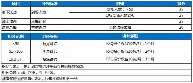 报名成为RFQ讲师,审核通过后线上线下的客户培训可以累积积分,兑换报价权益。