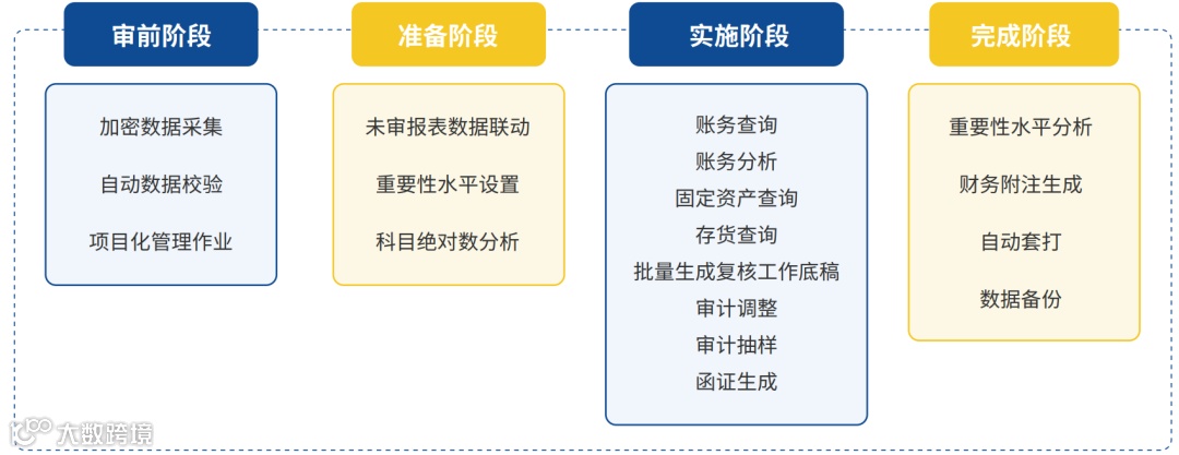 核心功能覆盖审前、准备、实施、完成四个阶段,让审计人员在全流程的操作过程都得心应手。
