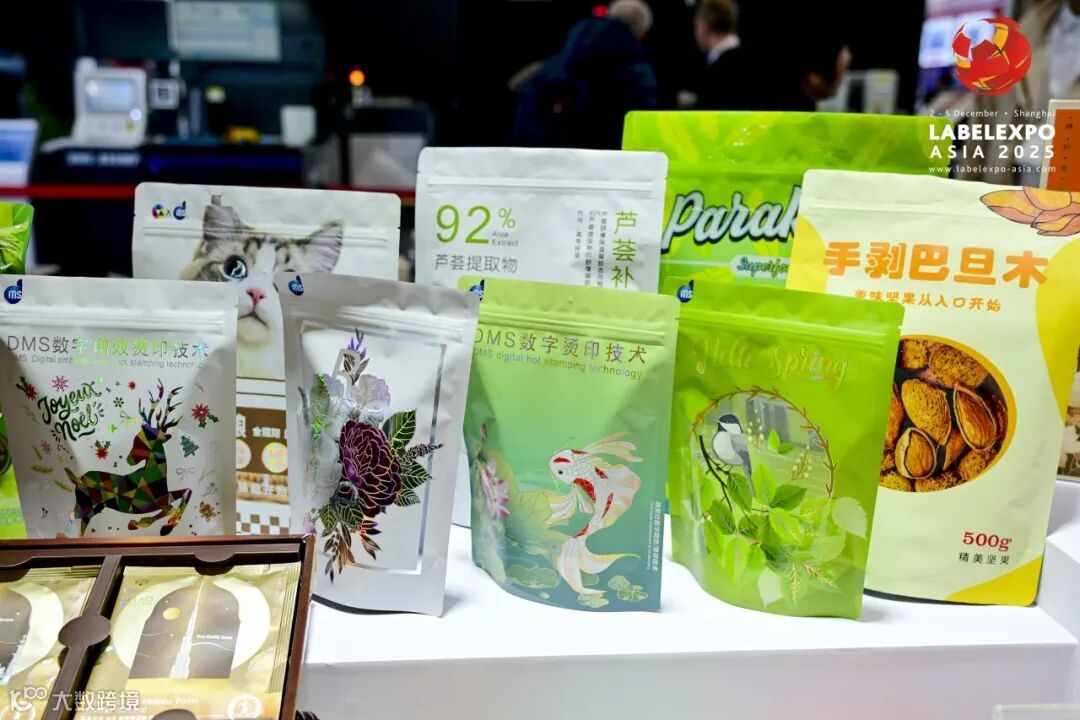 除了设备展示,德曼仕展台还设置了样品展示区。展台上陈列的数百种采用数字增效工艺的标签和软包装样品,全面展示了数字增效技术在不同行业的应用成果,吸引了大量观众驻足细看。