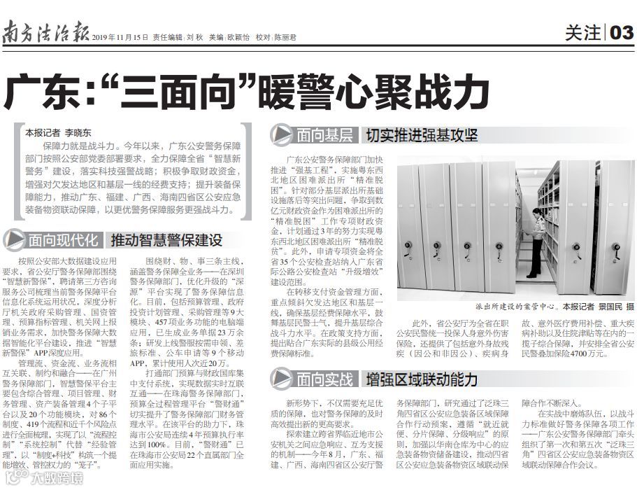 2019年11月15日,南方法治报总第1330期第3版专栏文章《广东:“三面向”暖警心聚战力》第二部分对广州智慧警保平台进行了系统概述,特转载于后。