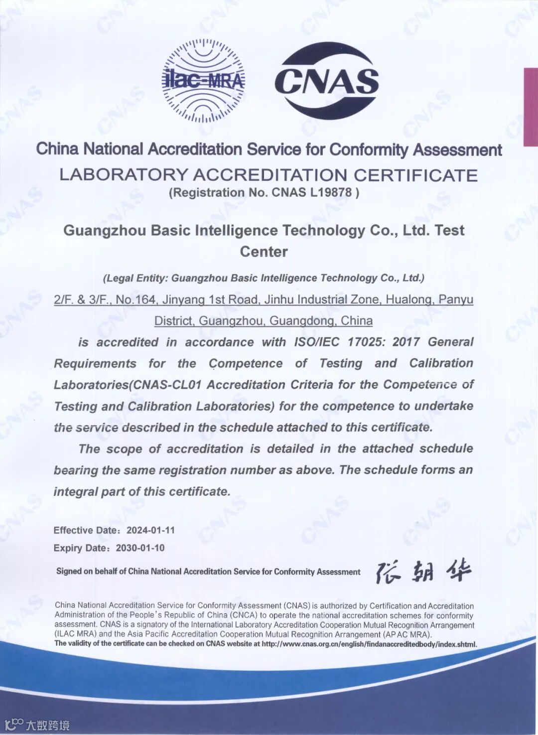 在2023年11月11日至12日的两天里,经过紧张激烈的现场评审,广州柏诚智能科技有限公司测试中心成功通过了中国合格评定国家认可委员会(CNAS)严谨的现场考核。从意向申请、正式申请、评审准备、文件评审,到最后的现场评审和认可批准,每一个环节都充分展现了广州柏诚的实力与专业。