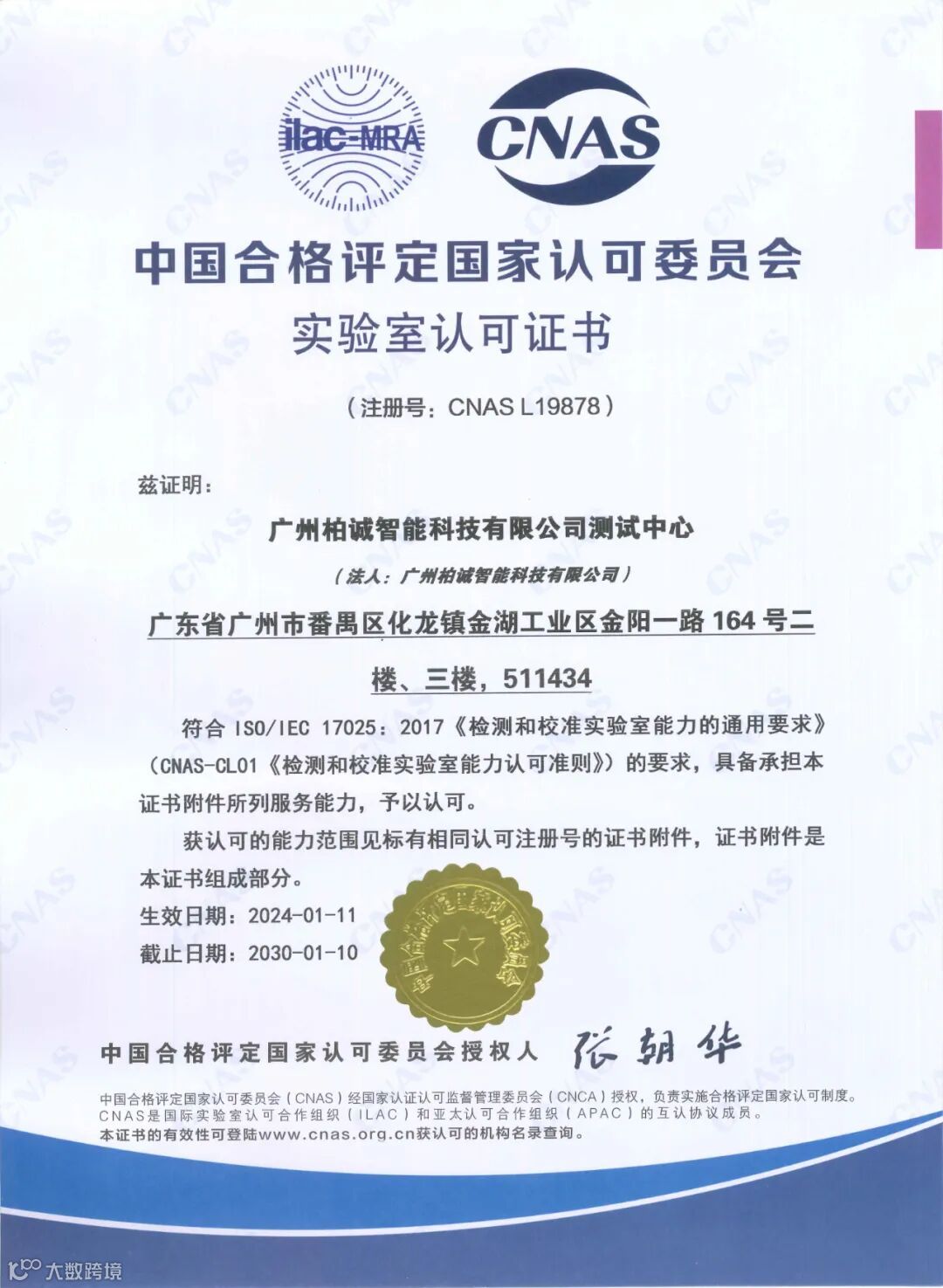 1、喜报 | 广州柏诚智能科技有限公司测试中心