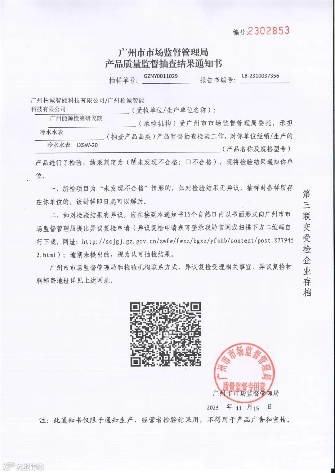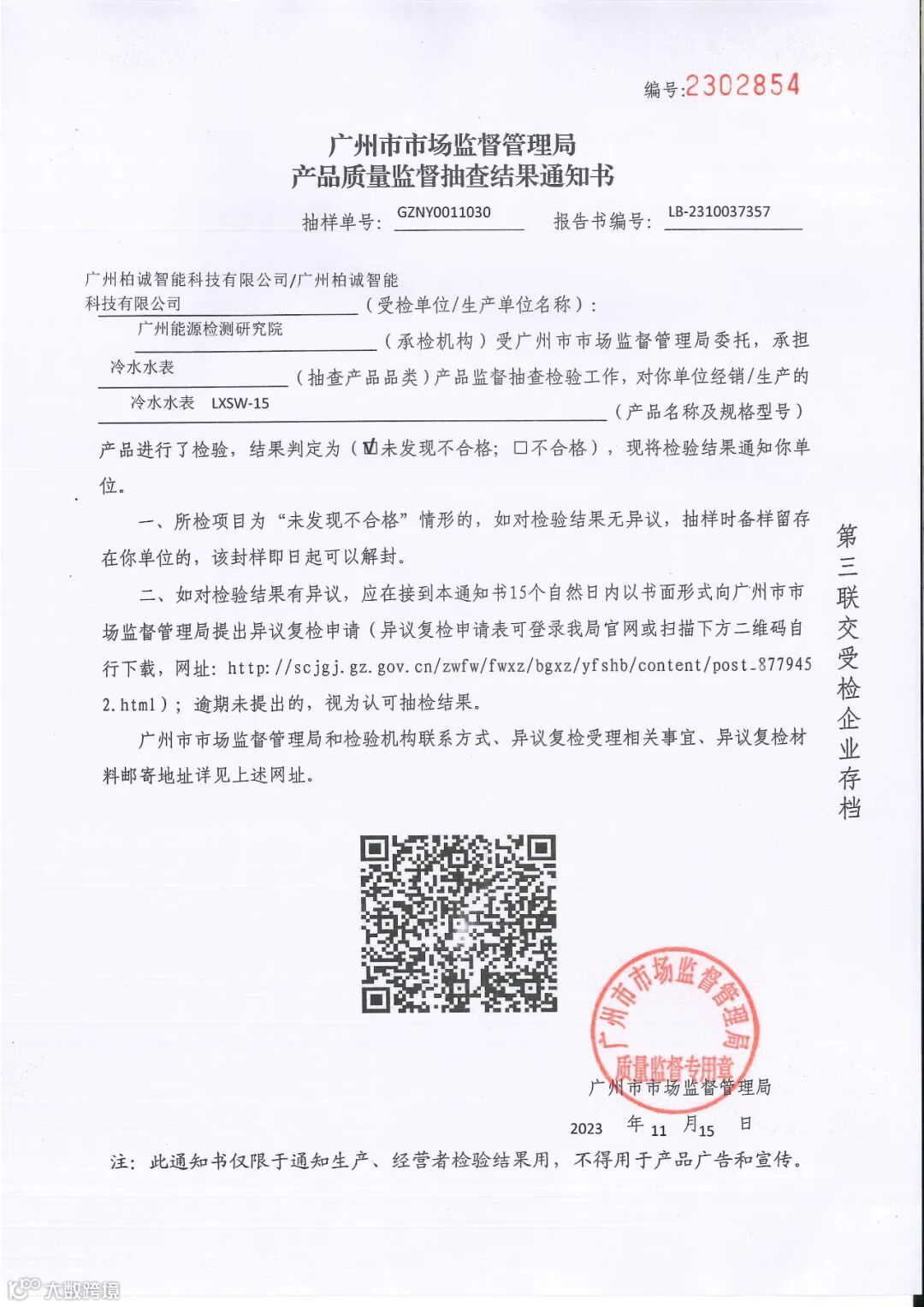 近日,广州柏诚智能科技有限公司收到了市场监督管理局开展的产品质量监督抽查结果通知书,检验结果显示我司生产的水表抽检合格。