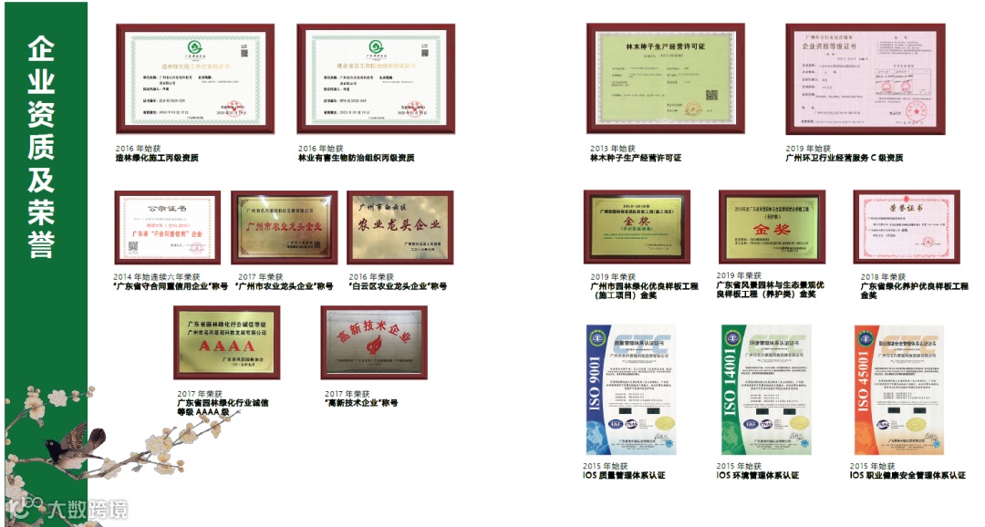名卉公司自成立以来一直坚守在园林绿化、花卉生产行业一线,拥有“风景园林工程设计专项资质”“林业调查规划设计资质”“造林工程施工资质”“林业有害生物防治公司资质”“林木种子生产经营许可证”等经营资质,先后取得国家高新技术企业、广东省工程技术研究中心、广东省重点农业龙头企业、广东省林业龙头企业等荣誉称号。