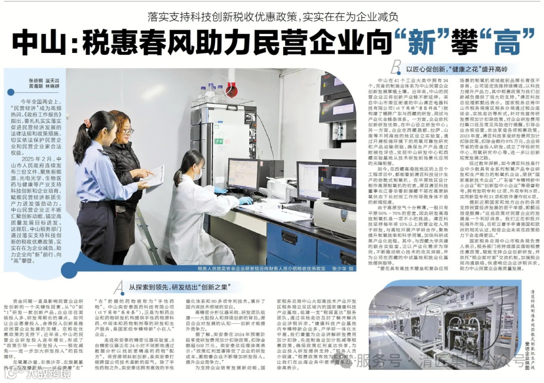 2025年2月,中山市人民政府连续发布三份文件,聚焦新能源、光电光学、生物医药与健康等产业支持科技创新和企业培育,赋能民营经济新质生产力迸发强劲动力。中山民营企业正不断汇聚创新动能,锚定高质量发展目标进发。这背后,中山税务部门通过落实支持科技创新的税收优惠政策,实实在在为企业减负,助力企业向“新”前行、向“高”攀登。