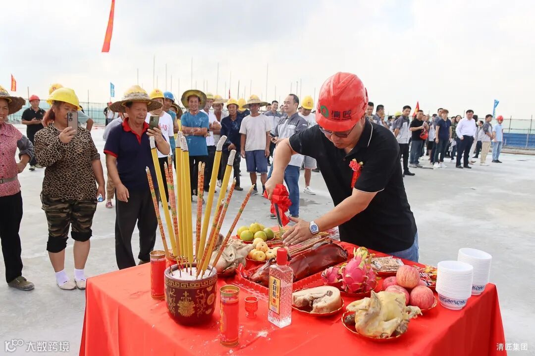 本次封顶仪式由集团副总经理朱总主持,隆重介绍了出席的各位领导、嘉宾们。紧接着,集团董事长李总率领公司高管们祈福拜神、喜切金猪,共同祝愿清匠集团及各子公司事业一“切”顺利、生意兴隆、吉祥如意、宏图大展!