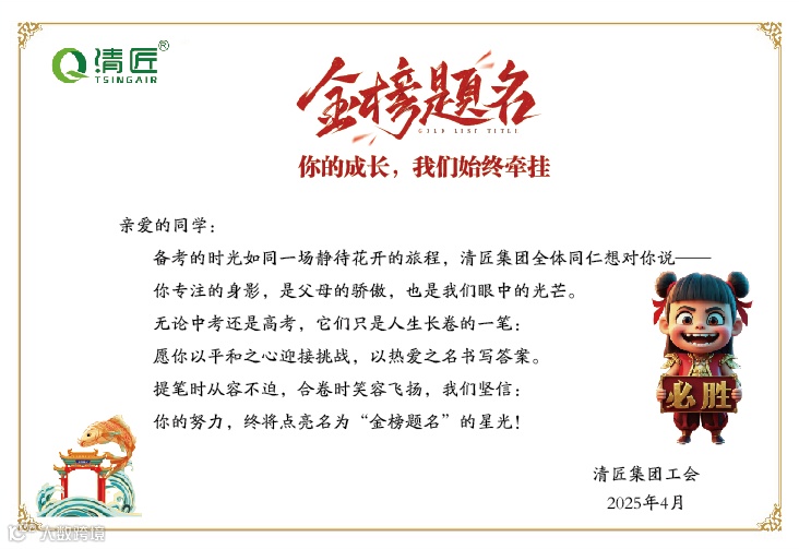 清匠集团工会寄语《致考生的一封信》,以长辈视角传递鼓励:“你专注的身影,是父母的骄傲,也是我们眼中的光芒。无论结果如何,你们永远是我们骄傲的少年!”