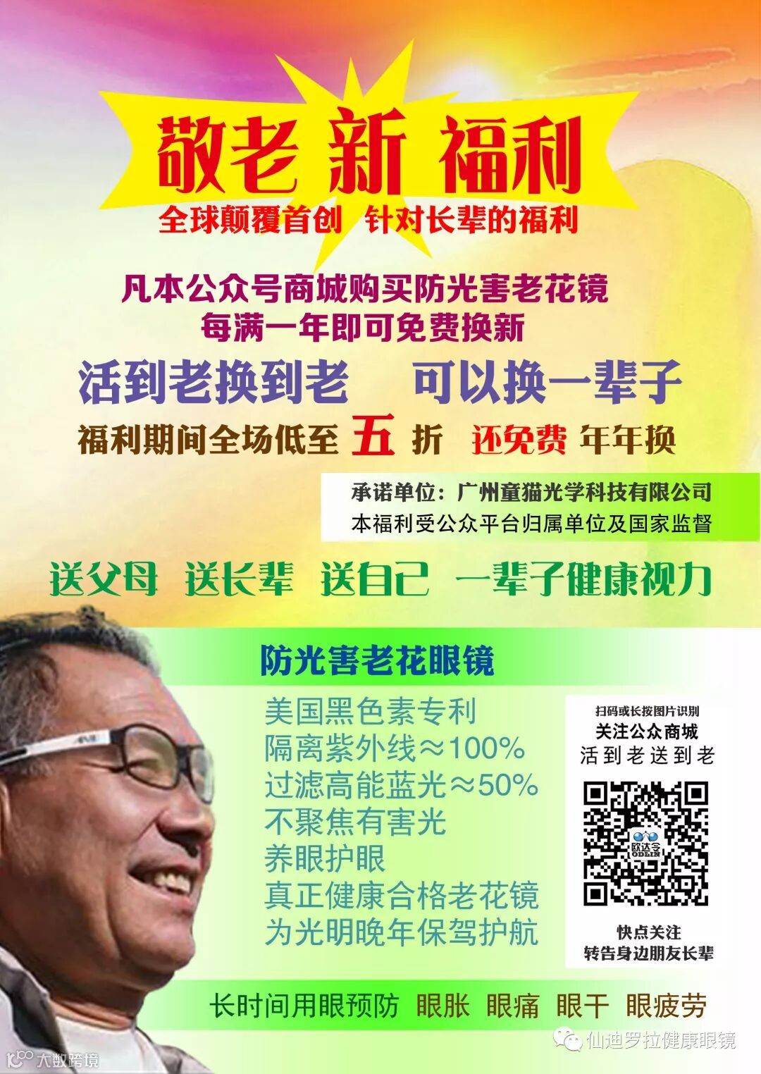仙迪罗拉另外一个分平台,欧达令健康眼镜公众平台推出敬老爱老活动,购买一次将终身免费换送,欢迎关注,及分享给你的亲人朋友长辈,给他们一辈子健康视力!
