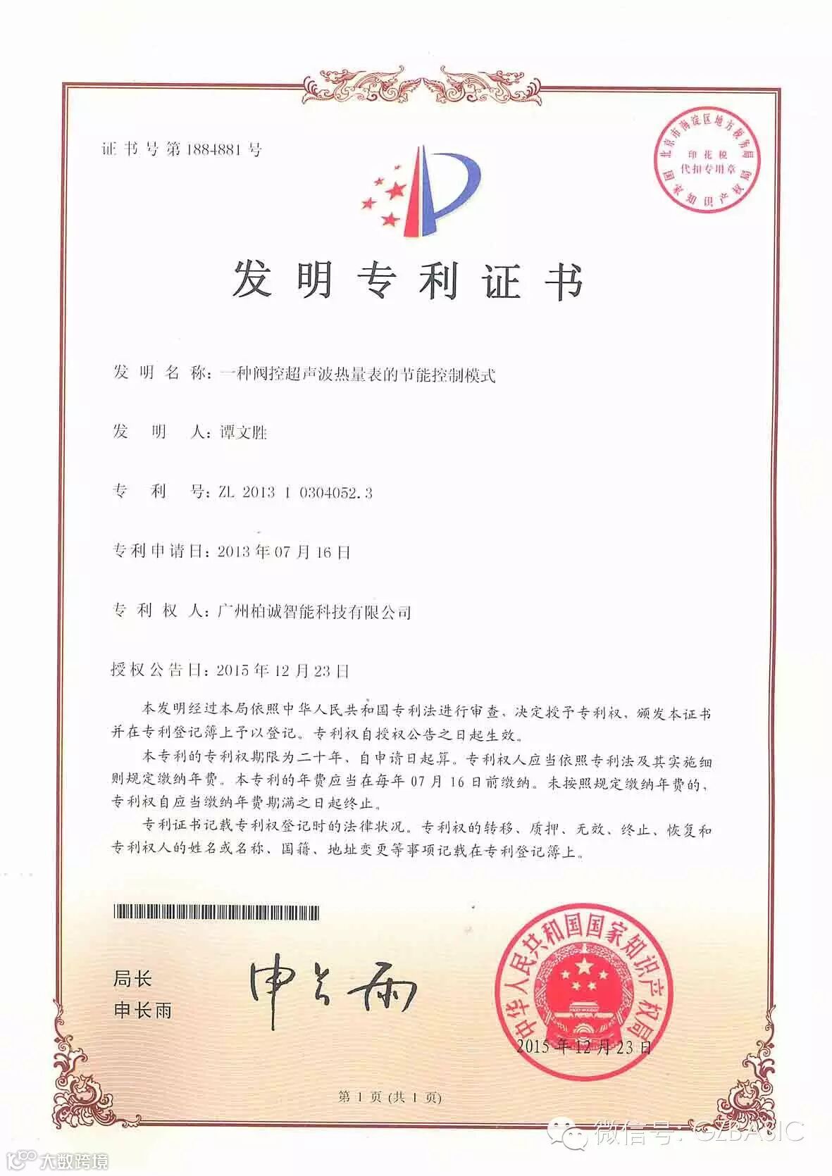 12月,柏诚《一种阀控超声波热量表的节能控制模式》成果,取得了发明专利证书,专利号ZL 2013 1 0304052.3。