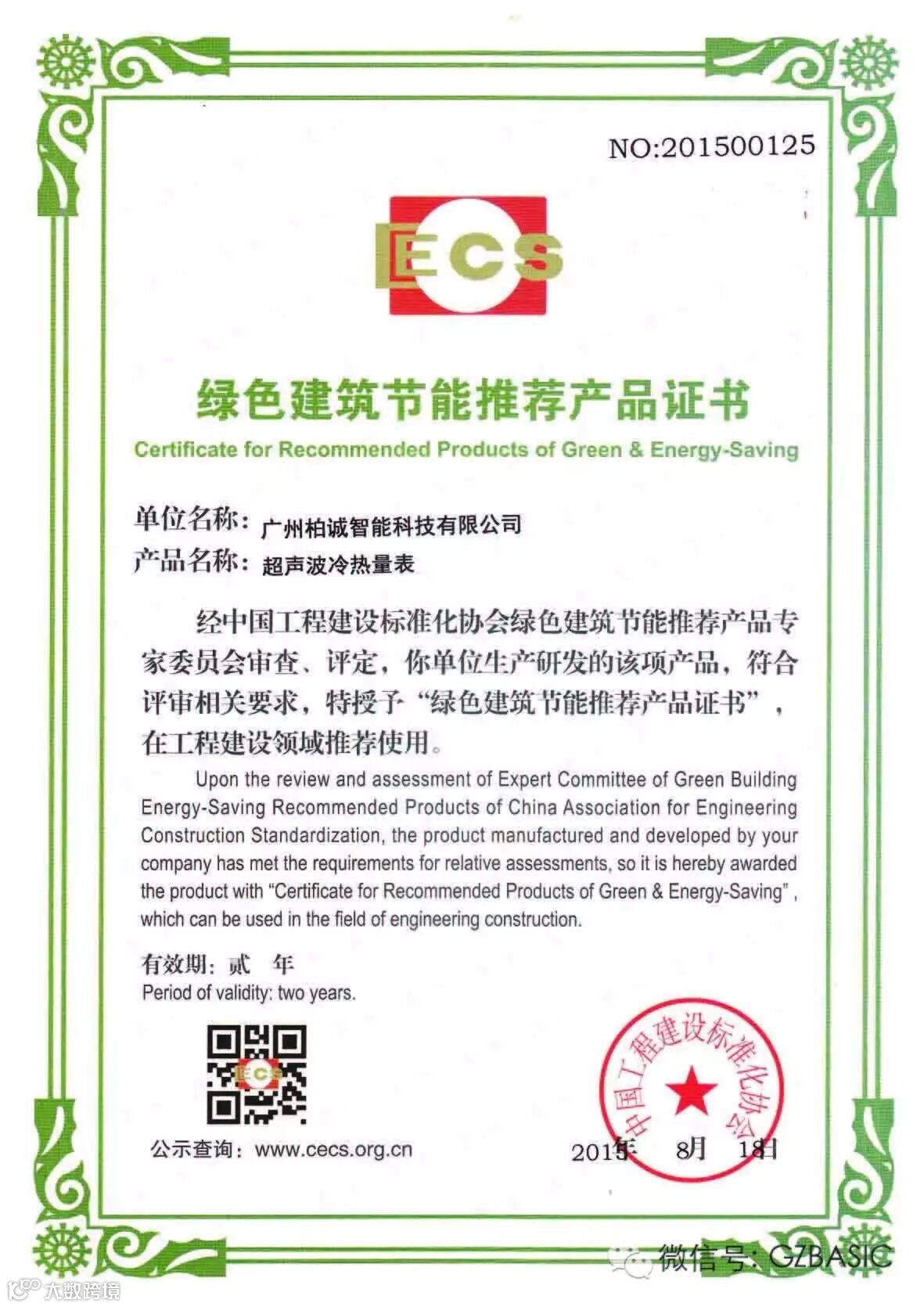 8月,柏诚 《超声波冷热量表》 产品,荣获由中国工程建设标准化协会的“绿色建筑节能推荐产品证书”并且在工程建设领域推荐使用。