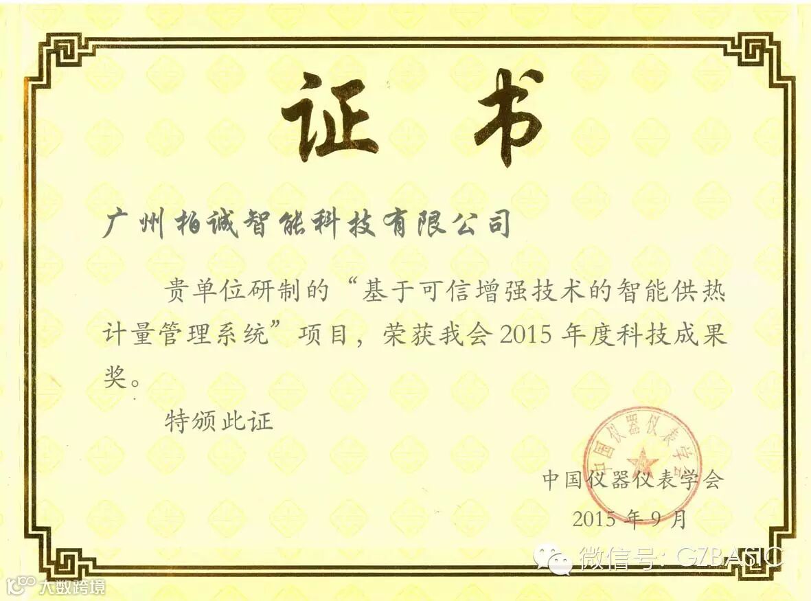 9月,柏诚 《基于可信增强技术的智能供热计量管理系统》成果,荣获中国仪器仪表学会2015年度科技成果奖荣誉。