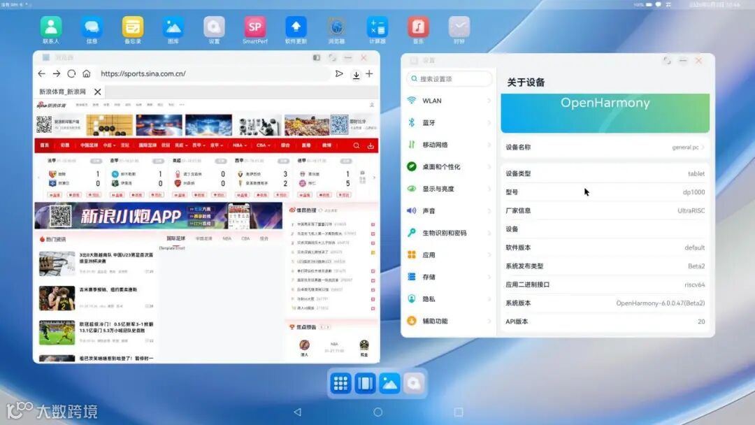 在演示环节中,搭载了超睿DP1000 CPU以及芯瞳CQ2040显卡的Titan 开发板烧录 OpenHarmony 6.0 成功启动进入桌面。