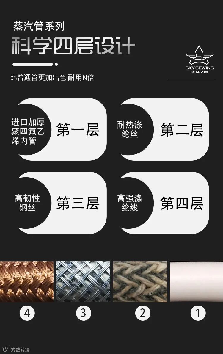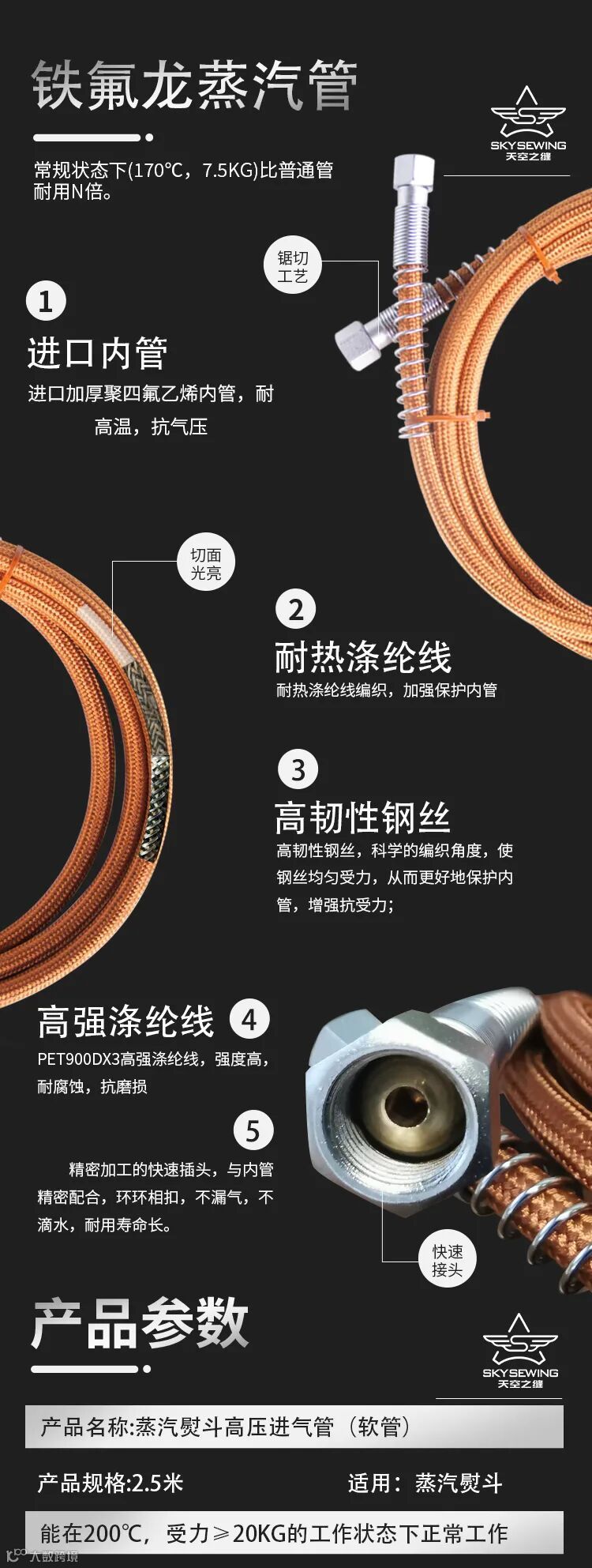 天空之缝铁氟龙蒸汽管是我司通过缝制行业的深入调查研究,重新按行业的最高标准作开发制造的产品。