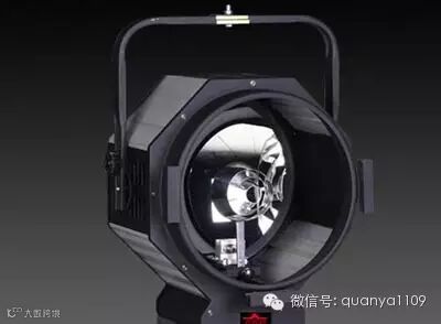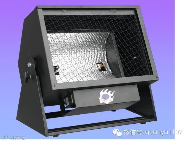 3.回光灯——此种灯前面无镜片,光线完全靠后面较大的反射镜射出,用同样2KW的灯泡,其亮度较聚光要亮,故在舞台上要表现强烈光源和亮度时使用。其效果较其他灯具为佳,特点是光束强烈,但调光时要注意其聚焦点,不宜将聚焦点调在色纸上或幕布上,这样容易引起燃烧,另外在调光时中心常出现黑心,为了避免黑心,在灯前端中心加一环状挡板,其射出的光斑大而不易收拢。现在新出一种在反光碗上镀膜使线外线向后透射,以减低灯前面的温度,使用效果很好,名称为冷光超级聚光灯,实际该灯的结构与回光灯相同。