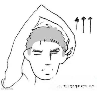 左手过头顶向上牵拉右侧耳朵数十次,然后右手牵拉左耳数十次。这一锻炼还可促进颌下腺、舌下腺的分泌,减轻喉咙疼痛,治慢性咽炎。