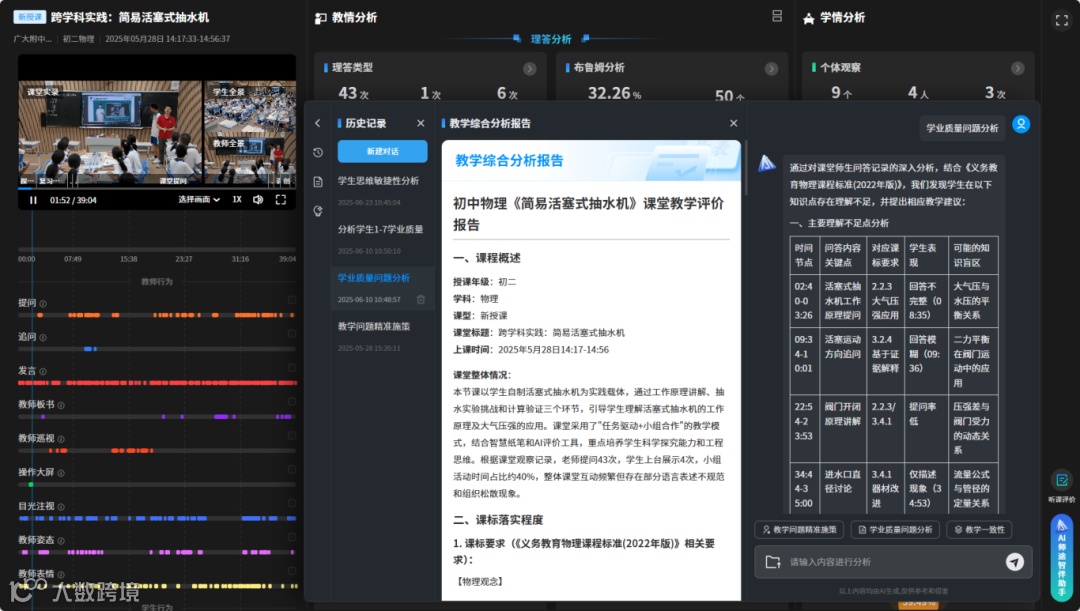 系统结合课堂教学多模态数据,结合大模型技术,形成课堂质量数据分析报告,辅助实现课堂教学多模态评价、智能督导,为确立“教、学、评”一体化智能评价新范式提供观测手段与依据;在此基础上,AI师途智伴进一步将抽象的课堂数据转化为可落地的策略建议,帮助教师基于具体教学情境,开展个性化的教学探索,加快形成“师-机-生”复合的教学深度应用。