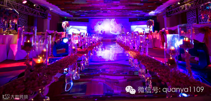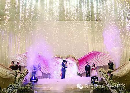 再就是要把追光灯架的高一些,避免人的遮挡,能够把效果全部发挥出来。当全场灯光暗下去的时候,追光灯对准新郎新娘,并且在他们2-3米的范围内形成一个亮的区域,目的就是突出新郎和新娘,而且在两台追光灯重合的时候要注意角度和追新人的方法,要错开来追新人。在这里,还可以用干冰机来制造烟雾效果,会让从烟雾中走出来的新娘子仿佛仙女一般。但是干冰的温度会比较低,要注意安全。在T台的引路区还可以视情况而定用几个地排灯,新人入场的时候一片黑暗,如果这时候加上一点点地排灯点缀一下,打上追光灯效果可能更好一些。