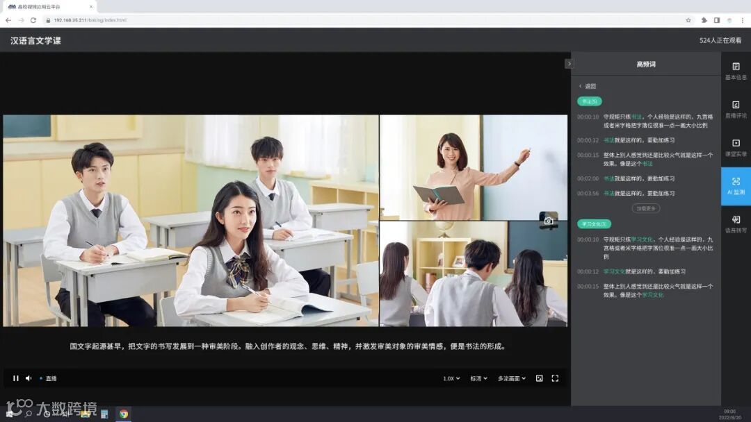 奥威亚高校教学资源应用及督导平台,支持负载均衡部署,可实现高并发直播应用。可以实现在线直播和点播回放,让学校不再受限于校区间距离、活动场地、传播媒介等因素,为举办学生活动、重要会议、学术交流及培训讲座提供技术支撑,极大地提升了教与学效率。