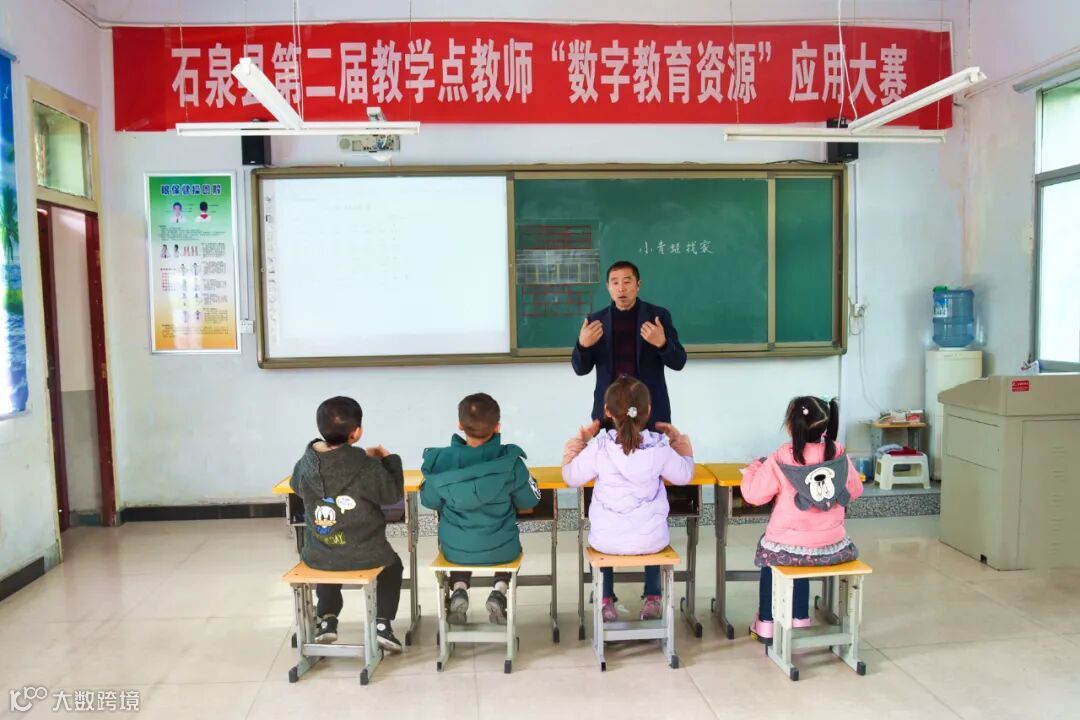 “春天在哪里呀,春天在哪里,春天在那小朋友的眼睛里……”在距石泉县城40余公里的后柳镇牛石川教学点,飘荡着稚嫩清脆的儿歌声,59岁的邓国财老师正在利用大屏幕给5个孩子上音乐课。