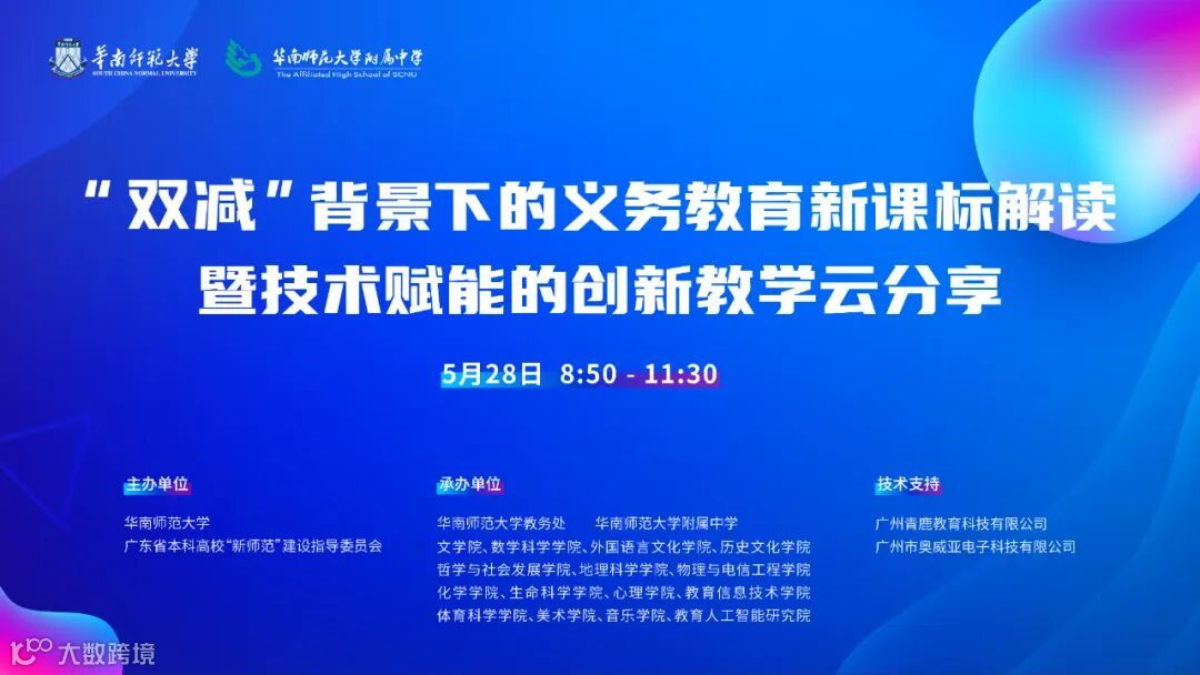 2022年5月28日上午,由广东省“新师范”建设指导委员会和华南师范大学联合主办的“双减”背景下的义务教育新课标解读暨技术赋能的创新教学云分享活动顺利开展。本次活动也是“教育部师范教育协同提质计划”华南师范大学牵头组团高校协同开展基础教育教师培训、提升基础教育服务能力的首次活动。