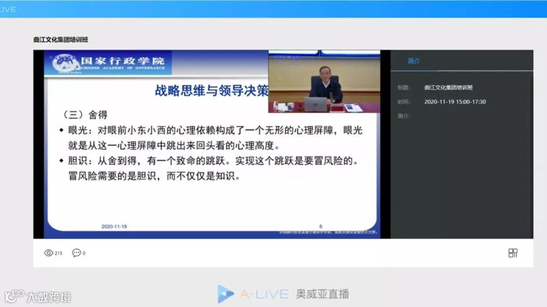 中央党校(国家行政学院)国际和港澳培训中心为西安曲江文化集团开展的一系列培训活动,以线上课堂的方式,将陕西西安、广东深圳和湖北荆州三地的学员们快速地组织起来,提供党建数字教育服务,开创了中央党校“党建数字教育”培训创新格局。